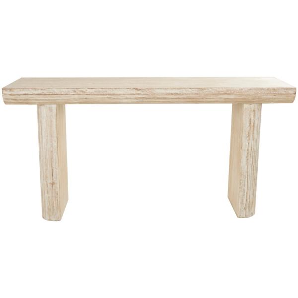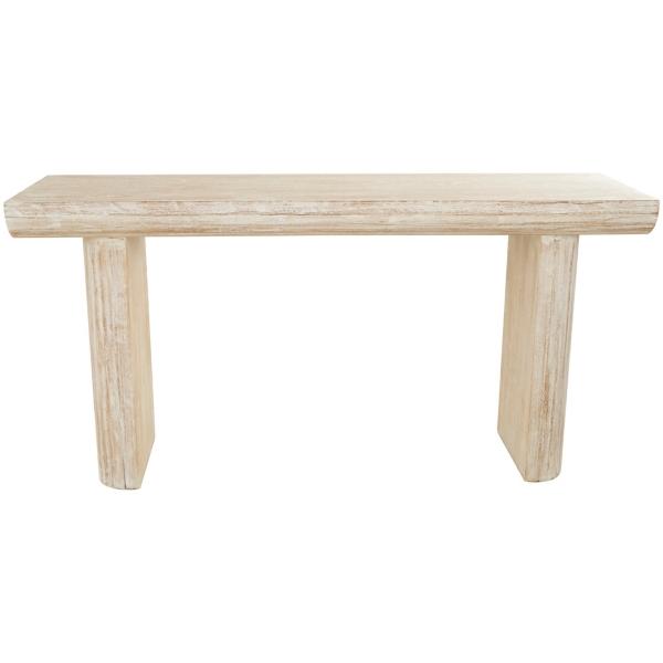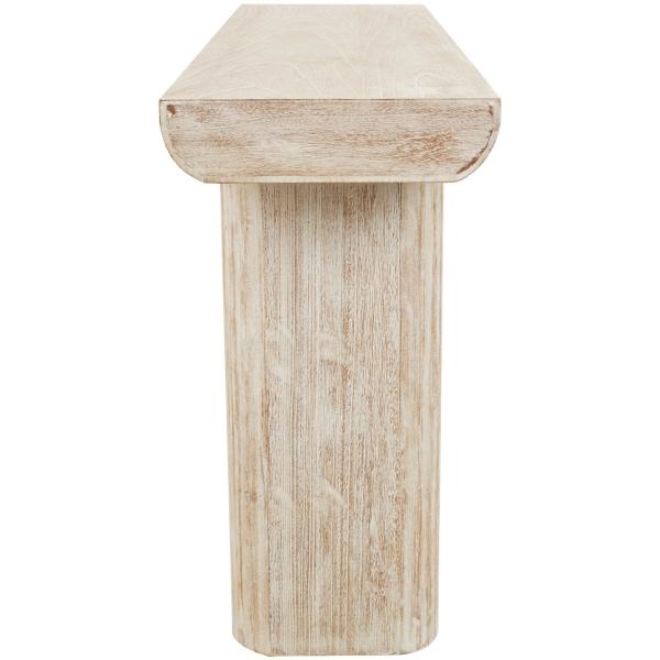 With an organic texture and appearance, this Ivory Natural Wood Grain Console Table will bring a beautiful touch of nature into your home. Its light finish and simple design makes this piece perfect for a laid-back, coastal style! Overall dimensions Width: 63" Depth: 15.7" Height: 31.7" Crafted of fir wood Ivory finish with natural distressing Natural wood grain design Weight: 37 lbs. Weight capacity: 250 lbs. Not intended for commercial use Care: Dust with a soft, dry cloth. This item is available at Kirklands.com only, not available in stores. Please note: this item cannot be shipped to APO/FPO addresses.