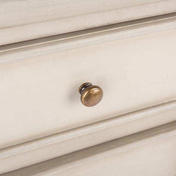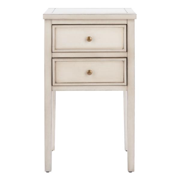 A French farmhouse take on a traditional end table, this Ivory Poplar Mirsade Traditional Accent Table makes a chic addition to any interior. Its rustic, light finish and gold drawer pulls complete the look. Overall dimensions Width: 16.9 in. Depth: 14.7 in. Height: 29.9 in. Crafted of poplar wood and metal Ivory finish Features two (2) drawers Gold drawer pulls Weight: 18.7 lbs. Weight capacity: 35 lbs. No assembly required Not intended for commercial use Care: Dust with a soft, dry cloth. This item is available at Kirklands.com only, not available in stores. Please note: this item cannot be shipped to APO/FPO addresses.