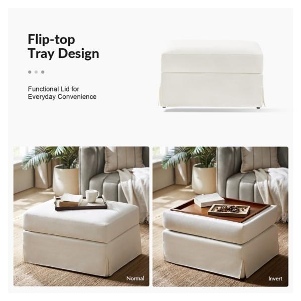 This Ivory Upholstered Kimberly Storage Ottoman is a versatile and functional addition to any living space! Designed with convenience in mind, it features interior storage space that's perfect for stowing away blankets or magazines. Ottoman measures 30L x 24W x 17.5H in. Crafted with a wood frame Upholstered in ivory polyester and filled with high density foam Features a flip-top tray design Interior storage space Removable and washable cover Storage space measures 25.5W x 20D x 9H in. Weight: 37 lbs. Weight capacity: 300 lbs. Assembly required. Not intended for commercial use Care: Spot clean. This item is available at Kirklands.com only, not available in stores. Please note: this item cannot be shipped to APO/FPO addresses.