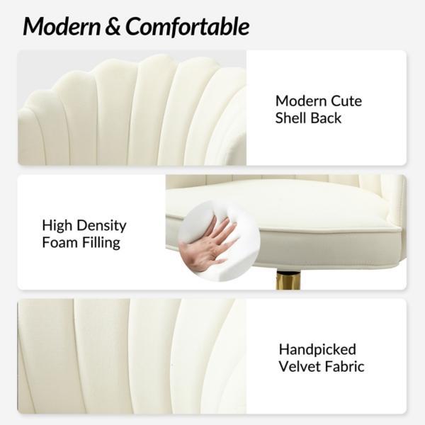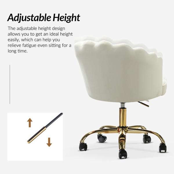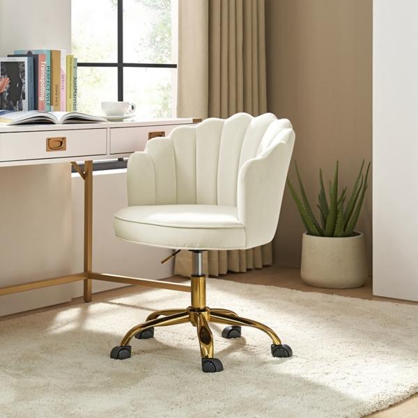 Style meets comfort for this chic Ivory Velvet Belanda Office Chair! Featuring plush ivory velvet, a scalloped backrest, and a sleek gold base, it’s built to impress and designed to support you throughout your whole day. Office chair measures 23W x 24.5D x 32H in. Crafted with a wood frame and metal base Upholstered in ivory velvet polyester and filled with high-density foam Gold metal finish Features a scalloped shell backrest design 360 degree swivel Adjustable height Seat measures 21W x 18.5D x 19.5H in. Weight: 16 lbs. Weight capacity: 250 lbs. Assembly required Not intended for commercial use Care: Spot clean. This item is available at Kirklands.com only, not available in stores. Please note: this item cannot be shipped to APO/FPO addresses.