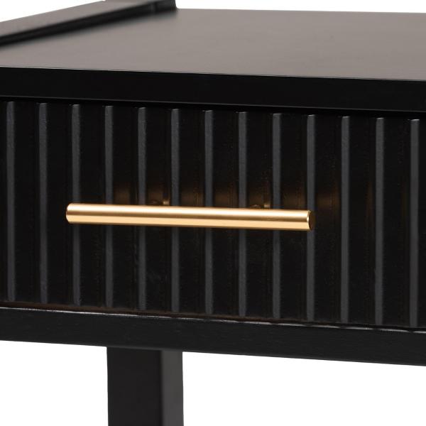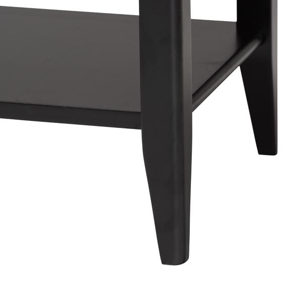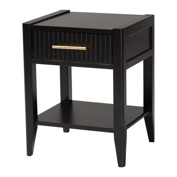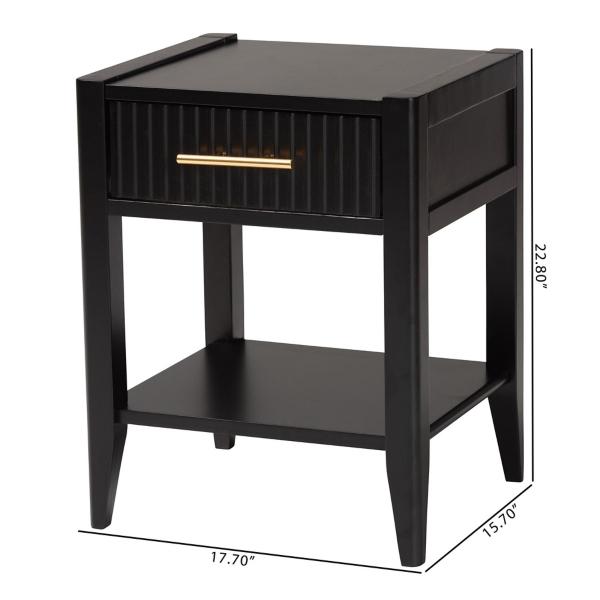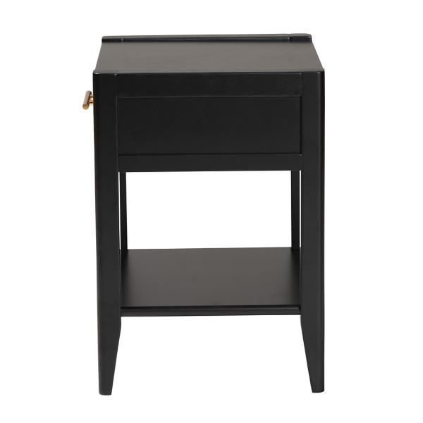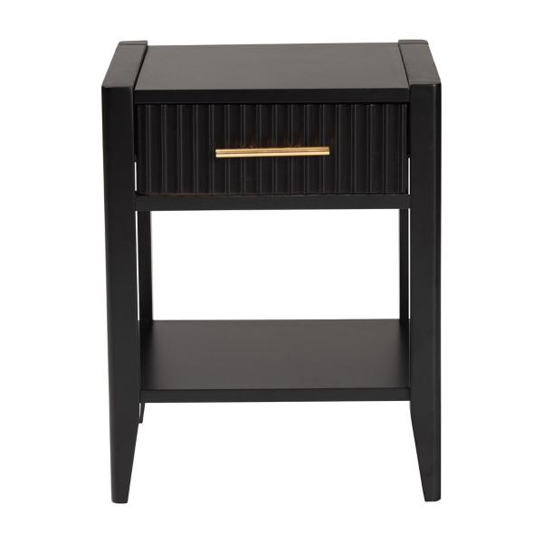 Give your bedroom a modern upgrade with the James Mid-Century Black 1-Drawer Nightstand. It's perfect for providing extra storage in small spaces with its elegant style. Nightstand measures 15.7L x 17.7W x 22.8H in. Crafted of wood and MDF Black finish Features one (1) interlocking drawer and one (1) open lower shelf Tapered legs Gold metal handle Assembly required Not intended for commercial use Care: Dust with a soft, dry cloth. This item is available at Kirklands.com only, not available in stores. Please note: this item cannot be shipped to APO/FPO addresses. WARNING: Cancer and Reproductive Harm - For more information go to www.P65Warnings.ca.gov.