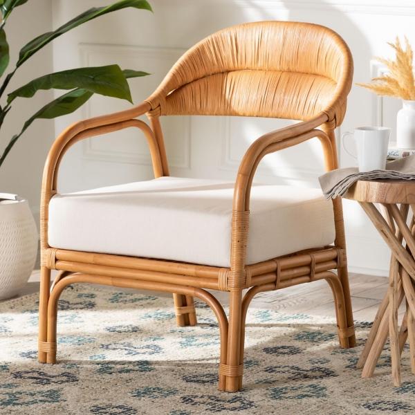 You'll love the style and comfort of this Light Honey Rattan Marisa Accent Chair! From its boho-inspired, handcrafted rattan frame to the padded removable cushion, you can relax in style. Chair measures 24W x 26.8D x 33H in.; seat height: 11 in. Crafted with natural rattan Cushion upholstered in ivory fabric and filled with high-density foam Light honey rattan finish Features a woven backrest Sloping armrests Rounded backrest Disclaimer: Rattan is a product of nature and may have variations in color, pattern, grain, and texture. Weight: 15.6 lbs. No assembly required Not intended for commercial use Care: Spot clean. Cushions are machine-washable. This item is available at Kirklands.com only, not available in stores. Please note: this item cannot be shipped to APO/FPO addresses.