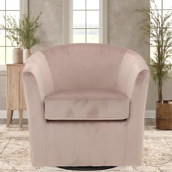 Comfort meets style with our Light Pink Swivel Barrel Accent Chair! Featuring a supportive back, armrests, and a thick cushion, this chair is perfect for setting up a cozy nook or relaxing den. Chair measures 30.5L x 27W x 30H in.; seat height: 19 in. Crafted with a wood frame and metal base Upholstered in polyester and filled with high-density foam Black base finish Light pink upholstery finish Barrel-shaped frame Features a 360 degree swivel base Removable seat cushion Crafted with sustainable materials Weight capacity: 300 lbs, No assembly required Made in the United States Not intended for commercial use Care: Spot clean. This item is available at Kirklands.com only, not available in stores. Please note: this item cannot be shipped to APO/FPO addresses.