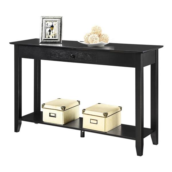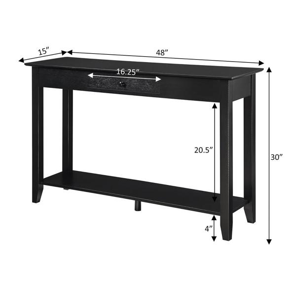 Whether placed in your living room, entryway, or hall, this Long Black Single Drawer Console Table easily adds style and storage to any space. It's ideal for display decor and keeping your home clutter free! Table measures 48L x 15W x 30H in. Crafted of solid pine wood, wood composite, and ash veneer Black finish Features one (1) drawer and one (1) shelf Square shape Weight: 40 lbs. Shelf weight capacity: 20 lbs. Assembly required Not intended for commercial use Care: Dust with a soft, dry cloth. This item is available at Kirklands.com only, not available in stores. Please note: this item cannot be shipped to APO/FPO addresses.