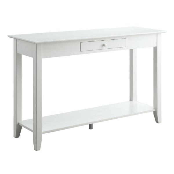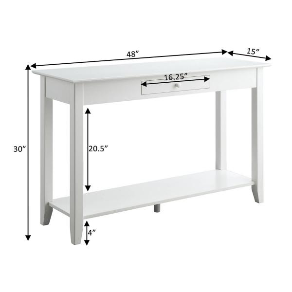 Create a beautiful display in your entryway, hall, or living room with this Long White Single Drawer Console Table. Its smooth, light finish and classically simple design will blend seamlessly with your home decor! Table measures 48L x 15W x 30H in. Crafted of solid pine wood, wood composite, and ash veneer White finish Features one (1) drawer and one (1) lower shelf Weight: 37 lbs. Shelf weight capacity: 20 lbs. Assembly required Not intended for commercial use Care: Dust with a soft, dry cloth. This item is available at Kirklands.com only, not available in stores. Please note: this item cannot be shipped to APO/FPO addresses.