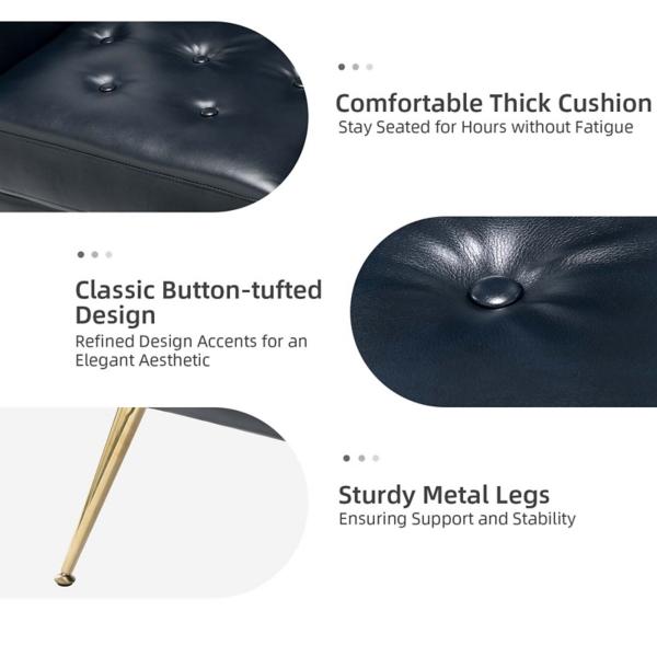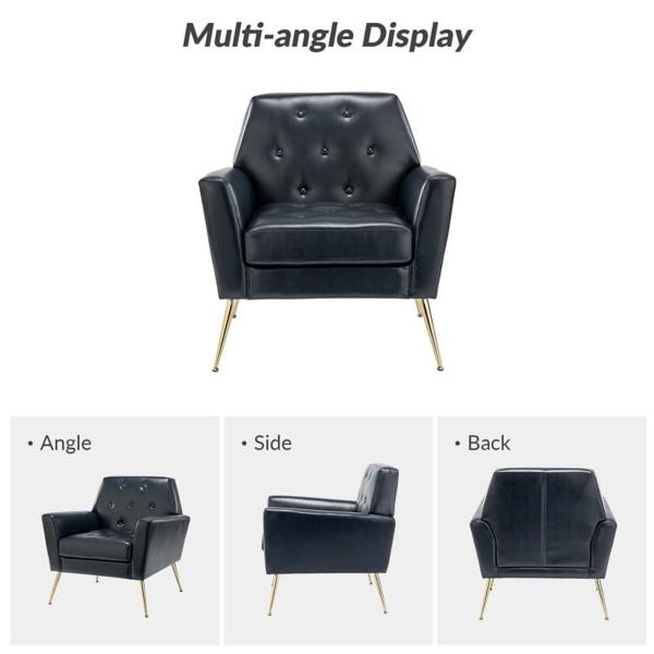 Elevate your space with the timeless charm of this Maris Navy Faux Leather Accent Chair! Upholstered in rich navy-colored faux leather, this chair boasts a sleek, angular silhouette and tapered legs that echo classic mid-century design. Chair measures 31W x 30.5D x 32.8H in. Crafted with a wood frame Upholstered in dark blue faux leather and filled with high-density foam Gold metal leg finish Features a button tufted deisgn Built-in S-spring and pocket spring Seat measures 20.5W x 22D x 18.5H in. Weight: 40 lbs. Weight capacity: 250 lbs. Assembly required Not intended for commercial use Care: Wipe with a soft, dry cloth. This item is available at Kirklands.com only, not available in stores. Please note: this item cannot be shipped to APO/FPO addresses.