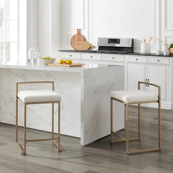 Our Marley Cream and Gold Counter Stools adds instant style and glamour to your kitchen! The gold metal frame and low open back makes these stools a modern work of art. Set includes two (2) counter stools Each stool measures 17.5L x 18.75W x 28H in.;Seat height 24 in. Frame crafted of metal Cream velvet like upholstered seat Gold frame finish Features a low open back design and a foot rest bar Weight capacity per stool: 250 lbs. Assembly required Not intended for commercial use Care: Spot clean only. This item is available at Kirklands.com only, not available in stores. Please note: this item cannot be shipped to APO/FPO addresses. WARNING: This product can expose you to chemicals including wood dust and lead which is known to the state of California to cause cancer and birth defects or other reproductive harm. For more information go to www.P65Warnings.ca.gov.