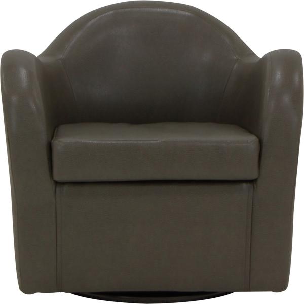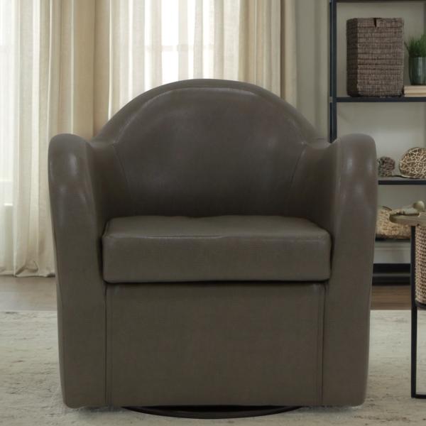 Take it easy in this Max Charcoal Faux Leather Swivel Club Accent Chair! This stylish swivel accent chair has an eye-catching design with dark gray faux leather to elevate any space. Accent chair measures 30.5W x 27D x 30H in. Crafted with a wood and metal frame Upholstered in gray faux leather and filled with high-density foam Features a traditional club chair design Curved armrests and backrest 360 degree swivel capability Seat dimensions: 20.5W x 19.5D x 19H in. Weight: 34 lbs. Weight capacity: 300 lbs. Crafted with sustainable materials No assembly required Made in the United States Not intended for commercial use Care: Spot clean. This item is available at Kirklands.com only, not available in stores. Please note: this item cannot be shipped to APO/FPO addresses.