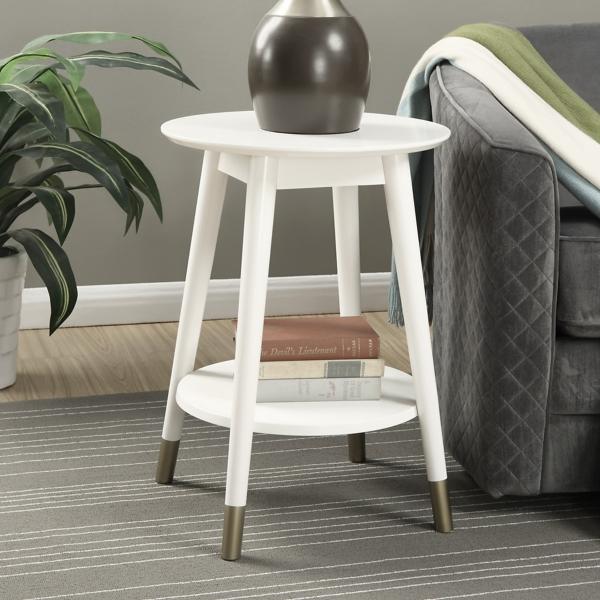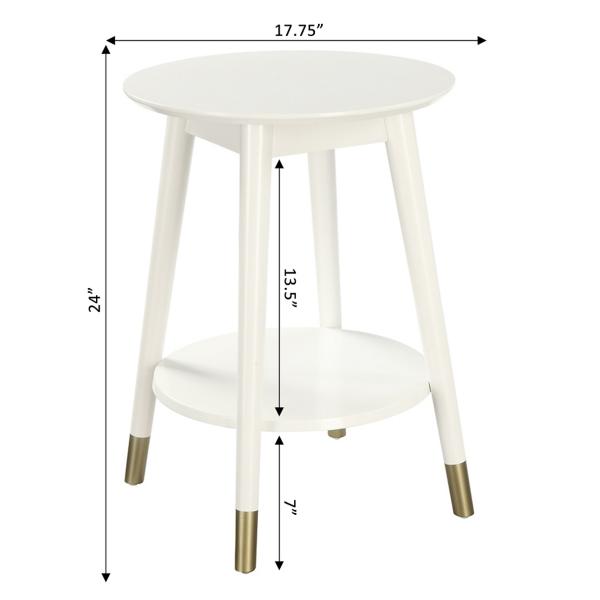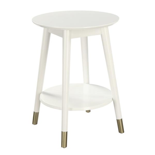 Update your furniture with the modern design of this Mia Round White Accent Table. With a chic look and subtle, golden details, this table will put style and function beside your sofa or bed! Table measures 24H x 17 in. in diameter Crafted of solid rubber wood, wood composite, and birch veneer White finish Round shape Features one (1) lower shelf Gold tipped legs Weight: 11 lbs. Shelf weight capacity: 20 lbs. Assembly required Not intended for commercial use Care: Dust with a soft, dry cloth. This item is available at Kirklands.com only, not available in stores. Please note: this item cannot be shipped to APO/FPO addresses.