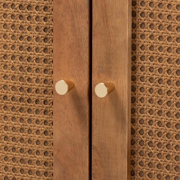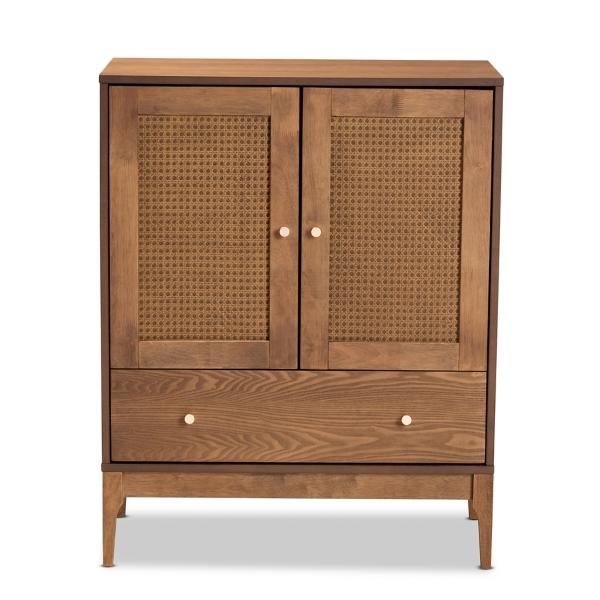 Elevate your home with our Mid-Century Modern Rattan Walnut Cabinet! This sophisticated cabinet will give your living room or entryway added storage and a stylish upgrade! Cabinet measures 31L x 16W x 38H in. Crafted of wood and rattan Walnut finish Rattan door panels Gold hardware finish Features two (2) shelves and one (1) drawer Drawer measures 26.80L x 13.60W x 4.30H in. Assembly required Not intended for commercial use Care: Dust with a soft, dry cloth. This item is available at Kirklands.com only, not available in stores. Please note: this item cannot be shipped to APO/FPO addresses. WARNING: This product can expose you to chemicals including formaldehyde and phthalate, which is known to the state of California to cause cancer and birth defects or other reproductive harm. For more information go to www.P65Warnings.ca.gov.