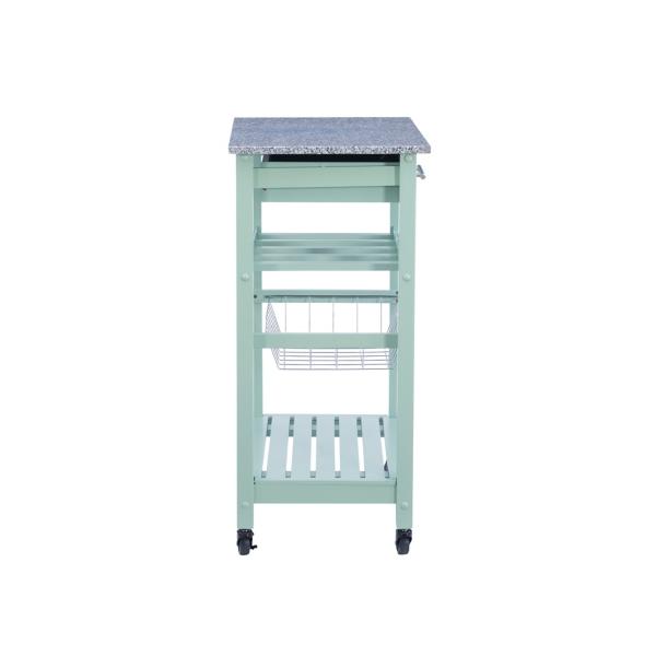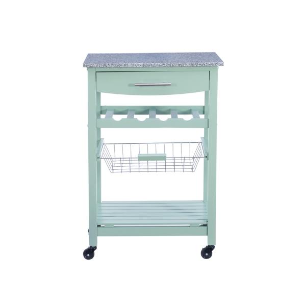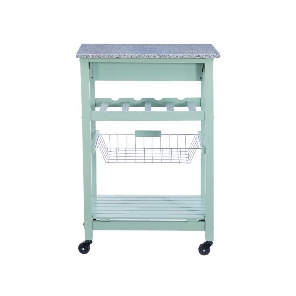 Upgrade your kitchen with this Mint Green Rolling Kitchen Cart with Granite Top! This cart is highly versatile, with a top to prep food, a built-in wine rack, a wire pull-out produce basket, and lower shelf for storage. The possibilities are endless with this rolling cart! Cart measures 15.75L x 22.75W x 33.75H in. Crafted of pine wood Mint green finish Features a gray and white granite top Includes a drawer, built-in wine rack, wire basket, and bottom shelf Easy rolling wheels with locking casters Granite top is food safe Weight: 41 lbs. Weight capacity: 150 lbs. Assembly required Not intended for commercial use Care: Wipe with a soft, damp cloth. This item is available at Kirklands.com only, not available in stores. Please note: this item cannot be shipped to APO/FPO addresses.