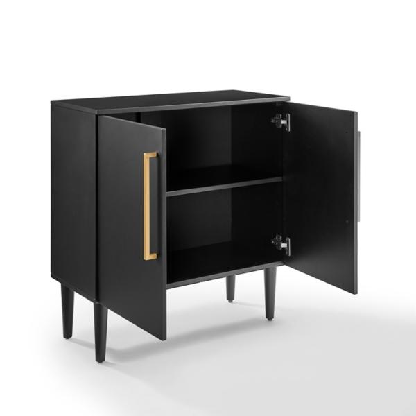 Store books, records, and other belongings with style with this Modern Black and Gold Cabinet. With its sleek, contemporary design and chic finish, it will give your living room or bedroom a nice, polished look! Cabinet measures 31L x 14W x 30.13H in. Crafted of wood and wood composite Black finish Features double doors and one (1) adjustable, interior shelf Doors feature magnetic closure Gold metal hardware Tapered legs Assembly required Not intended for commercial use Care: Dust with a soft, dry cloth. Wipe spills immediately with a clean cloth. This item is available at Kirklands.com only, not available in stores. Please note: this item cannot be shipped to APO/FPO addresses. WARNING: This product can expose you to chemicals including wood dust and lead which is known to the state of California to cause cancer and birth defects or other reproductive harm. For more information go to www.P65Warnings.ca.gov.
