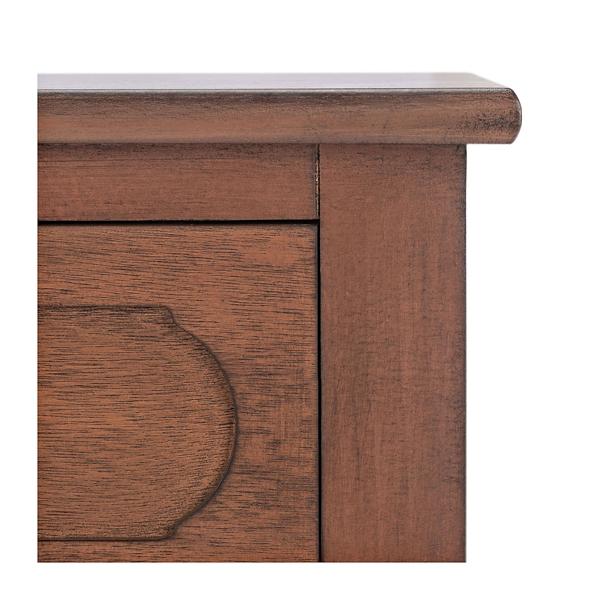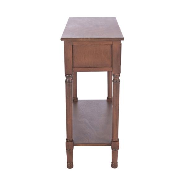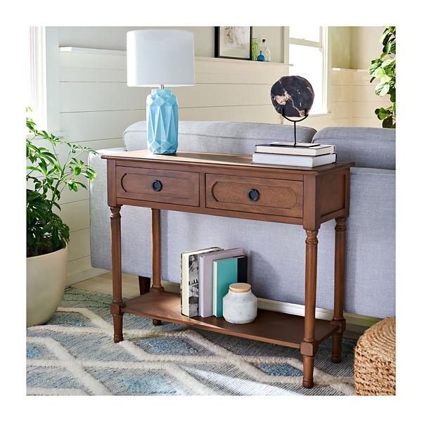 Refresh your living room with warm, contemporary style using this Modern Brown Carved Accent Console Table! You'll love how the subtle, geometric accents add a modern twist to its classic design. Table measures 35.5L x 13W x 29.5H in. Crafted of pine wood and wood composite Brown finish Black metal hardware finish Features two (2) drawers Includes a bottom shelf Weight capacity: 40 lbs. Assembly required Not intended for commercial use Care: Dust with a soft, dry cloth. This item is available at Kirklands.com only, not available in stores. Please note: this item cannot be shipped to APO/FPO addresses. WARNING: This product can expose you to chemicals including wood dust which is known to the state of California to cause cancer and birth defects or other reproductive harm. For more information go to www.P65Warnings.ca.gov.