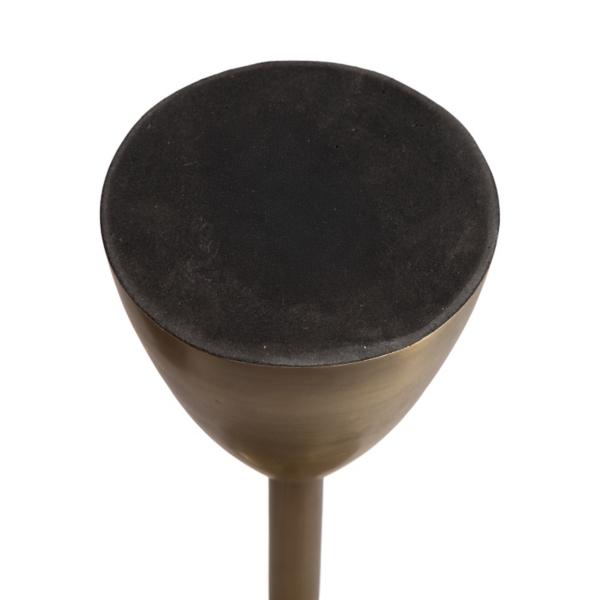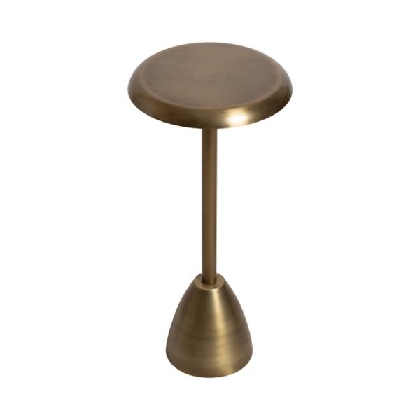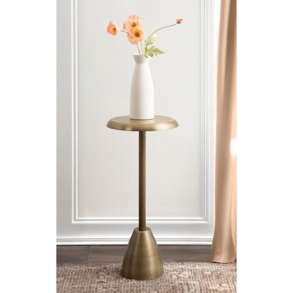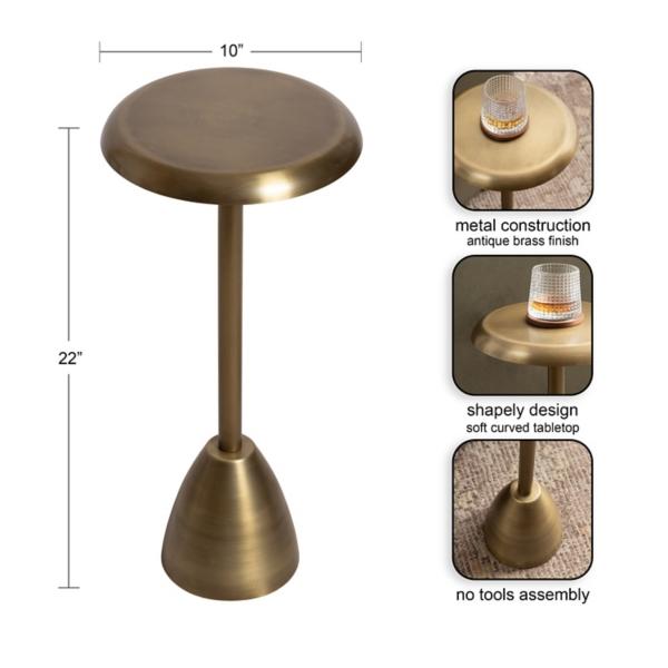 This Morizet Antique Brass Round Cocktail Table brings glamour and sophistication to your home! Its unique design and shape provides a modern and unmatched look. Table measures 22H x 10 in. in diameter Crafted of metal Antique brass finish Round shape Features a soft curved tabletop Pedestal base Weight: 5.17 lbs. Weight capacity: 7 lbs. Assembly required Not intended for commercial use Care: Wipe with a soft, dry cloth. This item is available at Kirklands.com only, not available in stores. Please note: this item cannot be shipped to APO/FPO addresses.