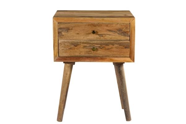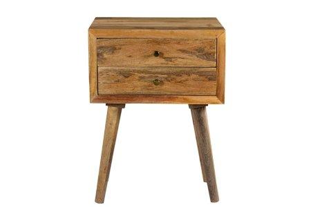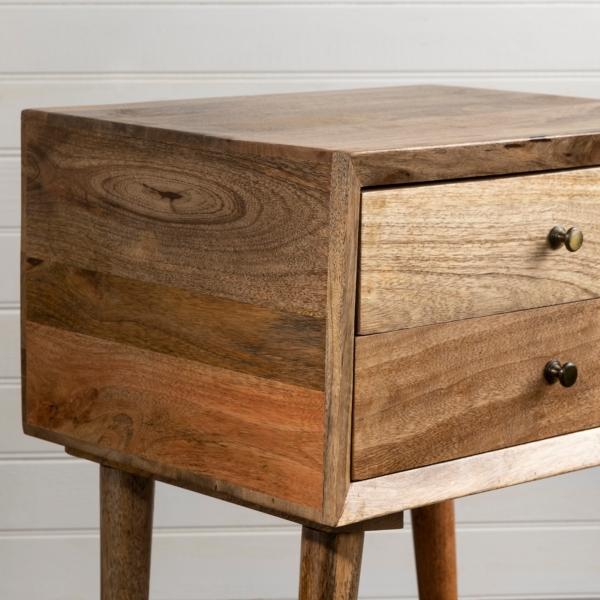 Bring natural style to any room in your home with this Natural Mango Wood 2-Drawer Accent Table. Its mid century design is sure to make a statement in any space. You'll love how its drawers bring needed storage to any room! Table measures 18L x 15W x 25H in. Crafted of mango wood Natural wood finish Rectangular tabletop shape Features two (2) storage drawers Accented with tapered rounded legs Weight: 20 lbs. No assembly required Not intended for commercial use Care: Dust with a soft, dry cloth. This item is available at Kirklands.com only, not available in stores. Please note: this item cannot be shipped to APO/FPO addresses.