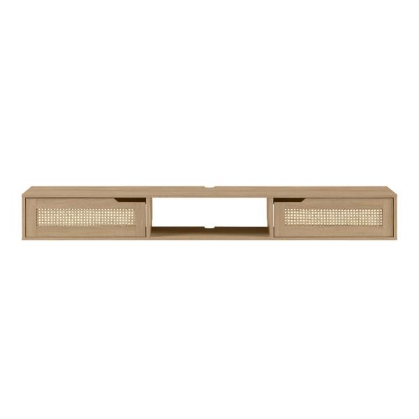 Elevate your space with this sleek Natural Modern Rattan Long Floating TV Stand! This TV stand features a contemporary look and compact design, perfect for upgrading small spaces. TV stand measures 70W x 9D x 8.75H in. Crafted of warp-resistant MDF, laminate, and faux rattan Natural finish Features two (2) fold-down doors with rattan insets Open and concealed storage Accompanies wall-mounted TVs up to 80 in. Cut-outs for cord management Middle shelf measures 22.5W x 9D x 7.6H in. Weight: 36 lbs. Assembly required; see Info & Guides in the drop down below to view or print assembly info Not intended for commercial use Care: Wipe with a soft, dry cloth. This item is available at Kirklands.com only, not available in stores. Please note: this item cannot be shipped to APO/FPO addresses.