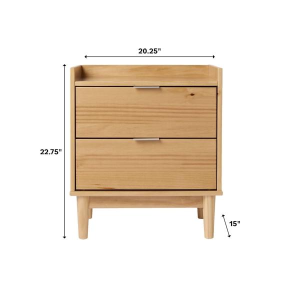 This Natural Pine 2-Drawer Gallery Top Nightstand features sleek hardware, a minimalist design, and spacious storage! This nightstand also offers a sustainably sourced solid pine wood build that sets this piece apart. Nightstand measures 20.25W x 15D x 22.75H in. Crafted of pine wood and metal Natural pine finish Features two (2) drawers Modern gallery back design Sleek, streamlined hardware Smooth drawer glides Made of responsibly sourced, sustainable materials Weight: 21 lbs. Weight capacity: 75 lbs. Assembly required Not intended for commercial use Care: Dust with a soft, dry cloth. This item is available at Kirklands.com only, not available in stores. Please note: this item cannot be shipped to APO/FPO addresses.