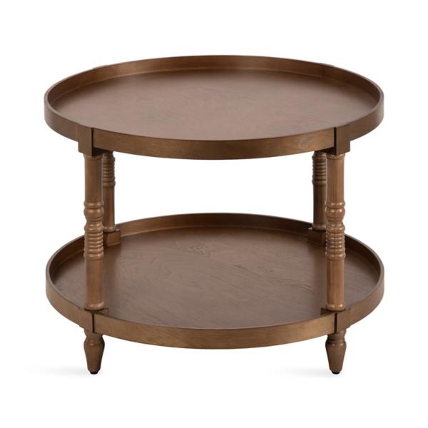 Elevate your home with a farmhouse flair with this this Natural Rustic Bellport Round Coffee Table. The two wooden tiers are perfect for creating display areas for candles, coffee table books, and other accents. Coffee table measures 20.5H x 28.25 in. in diameter Crafted of MDF Natural rustic brown finish Round shape Features a lower shelf for storage Turned wood legs Weight: 15 lbs. Weight capacity: 50 lbs. Assembly required Not intended for commercial use Care: Wipe with a soft, dry cloth. This item is available at Kirklands.com only, not available in stores. Please note: this item cannot be shipped to APO/FPO addresses.