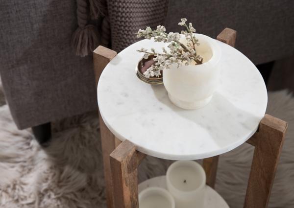 The Natural Wood and Marble Moxley Accent Table is the perfect way to bring organic modern beauty into your home. Handcrafted from natural materials, it has a stunning, one-of-a-kind look that you'll love. Table measures 24H x 12 in. in diameter Crafted of mango wood and marble Natural wood base finish White marble tabletop finish Features two (2) tiered design Round shape Assembly required Not intended for commercial use Handcrafted in India Care: Dust with a soft, dry cloth. This item is available at Kirklands.com only, not available in stores. Please note: this item cannot be shipped to APO/FPO addresses. WARNING: Cancer and Reproductive Harm - For more information go to www.P65Warnings.ca.gov.