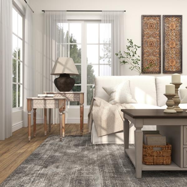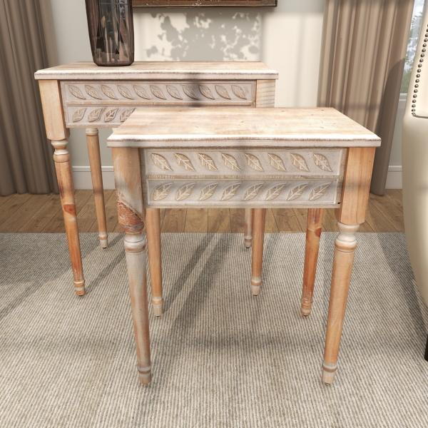 Refresh your living room lounge area with the set of Natural Wood Carved Leaf Accent Tables. Crafted with pillar style legs and a whitewashed finish, these tables embody classic farmhouse beauty. Set includes two (2) accent tables Large accent table measures 22.5L x 14.1W x 25H in. Small accent table measures 18.1L x 11.8W x 22H in. Crafted of fir wood and wood composite Natural whitewashed finish Carved leaf detailing Pillar style legs Rectangular shape Weight capacity: 100 lbs. No assembly required Not intended for commercial use Care: Dust with a soft, dry cloth. This item is available at Kirklands.com only, not available in stores. Please note: this item cannot be shipped to APO/FPO addresses. WARNING: Cancer and Reproductive Harm - For more information go to www.P65Warnings.ca.gov.