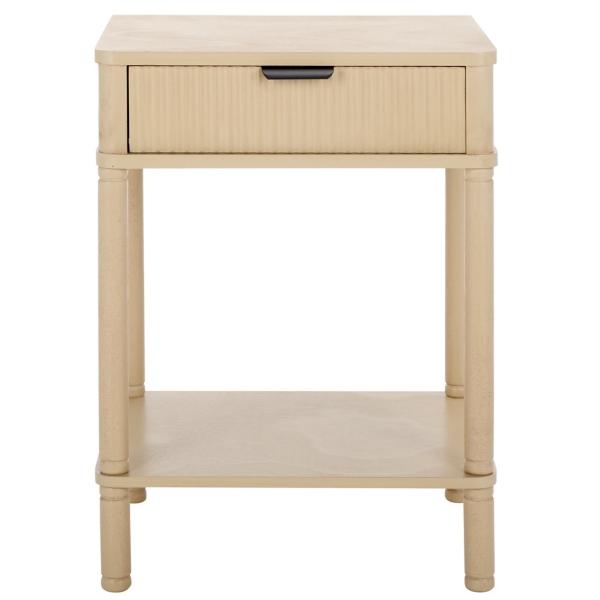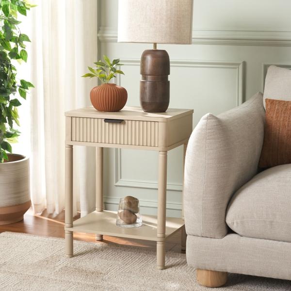From narrow hallways to small living rooms, this compact Natural Wood Mina End Table will deliver style and function to your home! Its sleek lines are complemented by its fluted drawer design for a touch of modern elegance to your space. End table measures 17.7W x 13.8D x 24H in. Crafted of pine and MDF Natural finish Features one (1) pull-out drawer and one (1) lower shelf Fluted drawer front Weight: 16.5 lbs. Weight capacity: 40 lbs. Some assembly required; see Info & Guides in the drop down below to view or print assembly instructions Not intended for commercial use Care: Wipe with a soft, dry cloth. This item is available at Kirklands.com only, not available in stores. Please note: this item cannot be shipped to APO/FPO addresses.