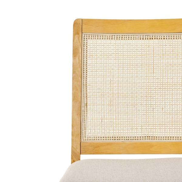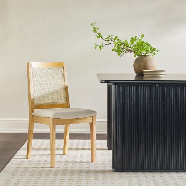These Natural Wood & Rattan Dining Chairs are perfect for bringing modern flair to your dining space! Designed with a natural rattan inset, these statement-making chairs provide warmth and contrast to any dining table. Set includes two (2) dining chairs Each chair measures 17.38W x 20.5D x 34H in.; seat height: 17.5 in. Crafted with a solid wood frame Upholstered in easy-to-clean woven fabric and filled with high-density foam Natural wood finish Features a rattan inset Adjustable foot levelers ensure stability Weight capacity: 300 lbs. each Assembly required; see Info & Guides in the drop down below to view or print assembly info Not intended for commercial use Care: Spot clean. This item is available at Kirklands.com only, not available in stores. Please note: this item cannot be shipped to APO/FPO addresses.