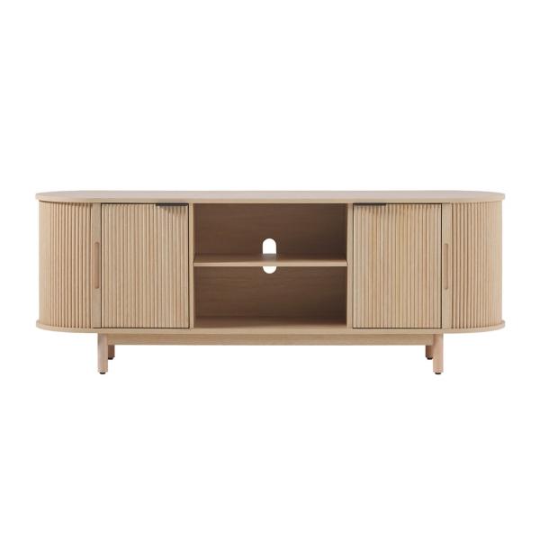 This Natural Wood Reeded Oval TV Stand is made with style and versatility in mind! Reeded door fronts elevate the design, combining sleek looks and practical functionality. You’ll love the combination of concealed cabinets and open cubbies! TV stand measures 60.13W x 15.75D x 22H in. Crafted of warp-resistant MDF and laminate Natural finish Oval shape Features reeded door fronts Two (2) sliding retractable side doors and two (2) cabinet doors Soft-close mechanisms Two (2) open cubbies for media storage Equipped with cable management hole Weight: 65 lbs. Weight capacity: 100 lbs. Assembly required Not intended for commercial use Care: Wipe with a soft, dry cloth. This item is available at Kirklands.com only, not available in stores. Please note: this item cannot be shipped to APO/FPO addresses.