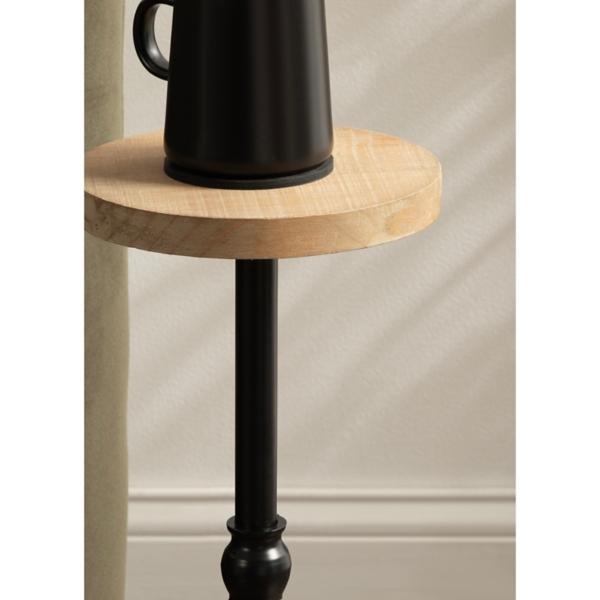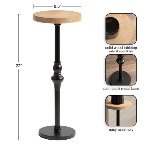 Bring a refined, sophisticated touch to your home with this Natural Wood Stratton Accent Table. This vintage-chic table features an ornate turned metal base, making it the perfect cocktail table or plant stand. Accent table measures 22H x 8.5 in. in diameter Crafted of metal Black finish Round shape Features a solid wood tabletop in a natural finish Spindle base design Weight: 5.7 lbs. Weight capacity: 7 lbs. Some assembly required Not intended for commercial use Care: Wipe with a soft, dry cloth. This item is available at Kirklands.com only, not available in stores. Please note: this item cannot be shipped to APO/FPO addresses.