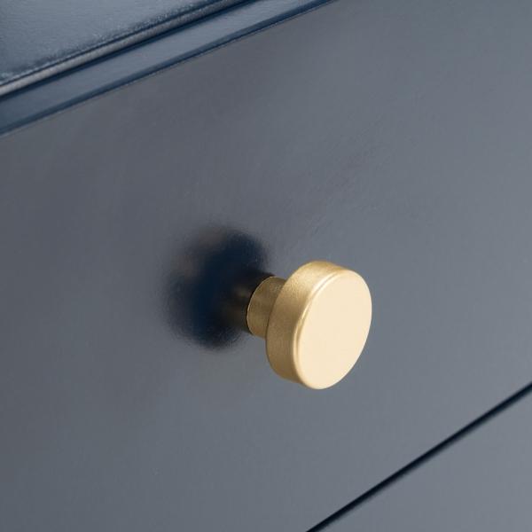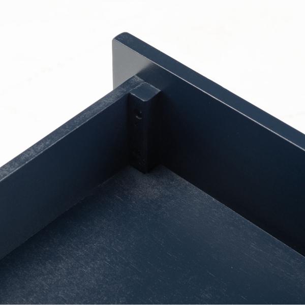 Give your decor a touch of glamour with this Navy 2-Drawer Lina Modern Accent Table. Its eye-catching silhouette, complete with a unique, elevated shelf, brings storage space and bold style to any room! Overall dimensions Width: 19 in. Depth: 15 in. Height: 24 in. Crafted of bayur wood and steel Navy finish Features two (2) drawers and one (1) elevated shelf Gold handles and accents Weight: 19.8 lbs. Weight capacity: 44 lbs. No assembly required Not intended for commercial use Care: Dust with a soft, dry cloth. This item is available at Kirklands.com only, not available in stores. Please note: this item cannot be shipped to APO/FPO addresses.