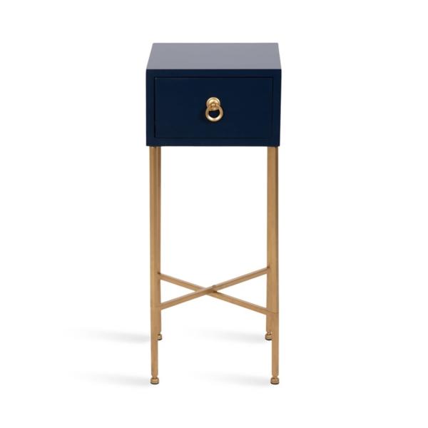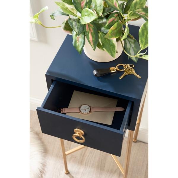 Our Navy Blue and Gold Glam Accent Table provides modern design and functional storage for any room! Embrace the chic, stylish design of this stunning piece to create an inviting aesthetic throughout your home. Accent table measures 11.75L x 11.75W x 30H in. Crafted of engineered wood and metal Navy blue finish Gold hardware finish Features one (1) drawer Square shape Weight capacity: 25 lbs. Assembly required Not intended for commercial use Care: Wipe with a soft, dry cloth. This item is available at Kirklands.com only, not available in stores. Please note: this item cannot be shipped to APO/FPO addresses. WARNING: Cancer and Reproductive Harm - For more information go to www.P65Warnings.ca.gov.