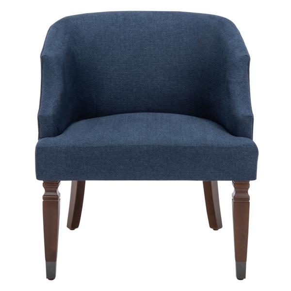Bring a classically charming touch to your home with this Navy Blue Linen Upholstered Harriet Accent Chair! This chair features subtle traditional details with a comfortable silhouette to effortlessly elevate your space. Chair measures 26.7W x 28.2D x 30H in.; seat height: 18.7 in. Crafted with a wood frame Upholstered in a polyester and nylon linen blend and filled with high-density foam Deep walnut wood leg finish Navy blue upholstery finish Features a rounded backrest Curved arms Tapered legs Weight: 27 lbs. Weight capacity: 275 lbs. Some assembly required; see Info & Guides in the drop down below to view or print assembly instructions Not intended for commercial use Care: Spot clean. This item is available at Kirklands.com only, not available in stores. Please note: this item cannot be shipped to APO/FPO addresses.
