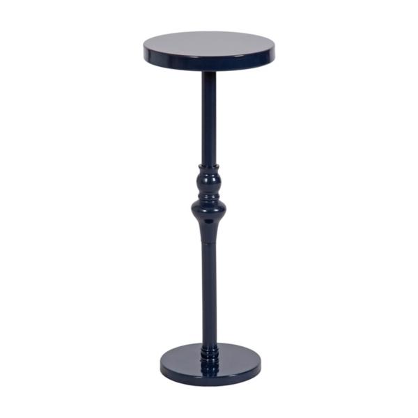 Bring a refined, sophisticated accent to your home with the Navy Blue Metal Stratton Cocktail Table. This chic, vintage-inspired accent table features a traditional pedestal base with a round tabletop. Cocktail table measures 22H x 8.5 in. in diameter Crafted of metal Shiny navy blue finish Round shape Features an ornate turned metal base Weight: 6 lbs. Weight capacity: 7 lbs. Easy assembly required Not intended for commercial use Care: Wipe with a soft, dry cloth. This item is available at Kirklands.com only, not available in stores. Please note: this item cannot be shipped to APO/FPO addresses.