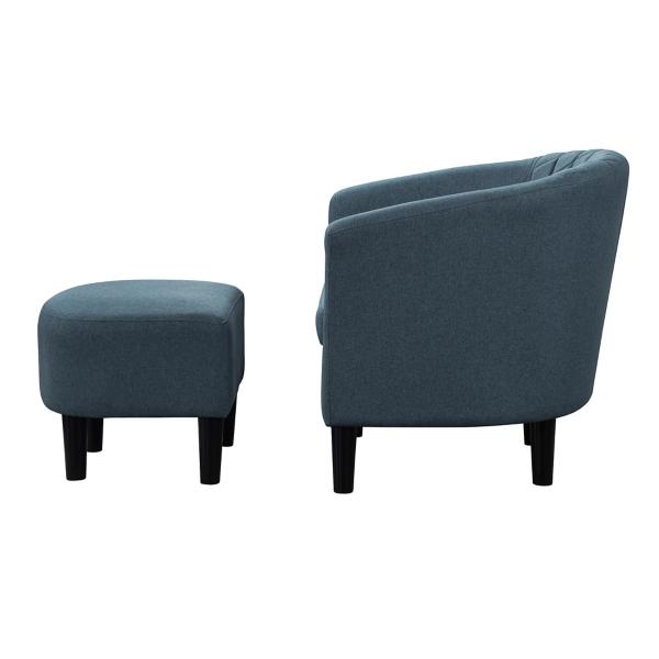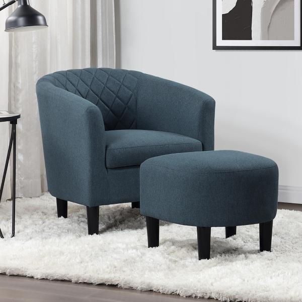 Relax in style with this Navy Tufted Accent Chair & Ottoman Set! This chair and ottoman set features stylish and soft upholstery with thick, padded cushions to make this your new go-to cozy chair. Set includes one (1) chair and one (1) ottoman Chair measures 27.75W x 27.25D x 27.5H in.; seat height: 17.5 in. Ottoman measures 19.5W x 17.75D x 16.25H in. Set crafted with a wood frame Upholstered in navy polyester and filled with high-density foam Features a classic barrel chair design Diamond tufted backrest U-shaped ottoman Assembly required Not intended for commercial use Care: Spot clean. This item is available at Kirklands.com only, not available in stores. Please note: this item cannot be shipped to APO/FPO addresses.