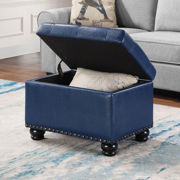 This Navy Faux Leather Jessy Storage Ottoman makes it easy to organize your space with a stylish touch! With a sophisticated faux leather upholstery and convenient hinged lid, this ottoman can be used for a variety of needs. Ottoman measures 24L x 17.75W x 18H in. Crafted with a wood frame Upholstered in blue faux leather with high-density foam Black wood finish Features interior storage space Button-tufted top Accented with nailhead trim Pressure hinges to allow lid to stay open on its own Assembly: Attach legs. Not intended for commercial use Care: Wipe with a soft, dry cloth. This item is available at Kirklands.com only, not available in stores. Please note: this item cannot be shipped to APO/FPO addresses.
