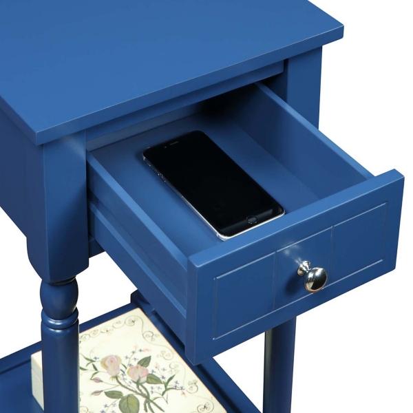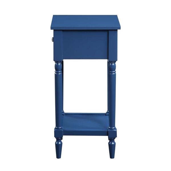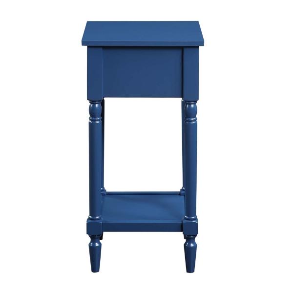 Featuring storage space and a beautifully smooth finish, this Navy French Country Square Accent Table will make a stylish and functional addition to any space! Its classic design is an ideal base for decor and easily complements any furniture. Table measures 14L x 14W x 28H in. Crafted of wood composite and solid wood Navy painted finish Features one (1) drawer and one (1) lower shelf Turned legs Engraved design on drawer face Weight capacity: 17 lbs. Shelf weight capacity: 20 lbs. Assembly required Not intended for commercial use Care: Dust with a soft, dry cloth. This item is available at Kirklands.com only, not available in stores. Please note: this item cannot be shipped to APO/FPO addresses.