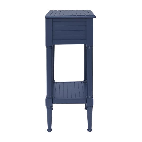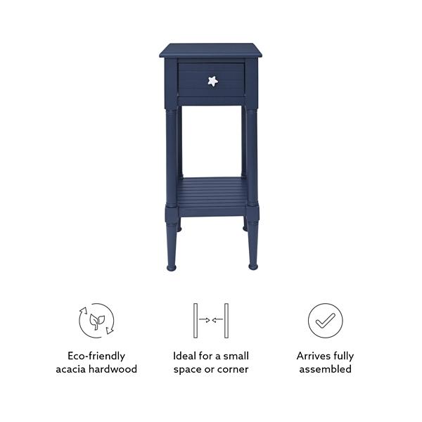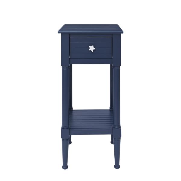 With its rustic finish and starfish hardware, this Navy Wood Coastal Compact Accent Table will make the perfect addition to your beach house or nautical decor! It's ideal for some extra storage in smaller spaces. Table measures 14L x 13W x 29.5H in. Crafted of wood and wood composite Navy finish Features one (1) drawer and one (1) lower shelf Beadboard wood design Features white starfish drawer pull Weight capacity: 50 lbs. Assembly required Not intended for commercial use Care: Dust with a soft, dry cloth. This item is available at Kirklands.com only, not available in stores. Please note: this item cannot be shipped to APO/FPO addresses.