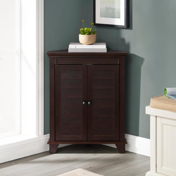 Bring your space style and storage with our Nikki Dark Brown Wooden Corner Cabinet! Featuring spacious shelves and drawers, this cabinet would look lovely in a bathroom or office. Cabinet measures 22L x 12W x 28.8H in. Crafted of wood composite Dark brown finish Corner design Features two (2) cabinets with inner shelves Assembly required Not intended for commercial use Care: Dust with a soft, dry cloth. This item is available at Kirklands.com only, not available in stores. Please note: this item cannot be shipped to APO/FPO addresses. WARNING: This product can expose you to chemicals including wood dust and lead which is known to the state of California to cause cancer and birth defects or other reproductive harm. For more information go to www.P65Warnings.ca.gov.
