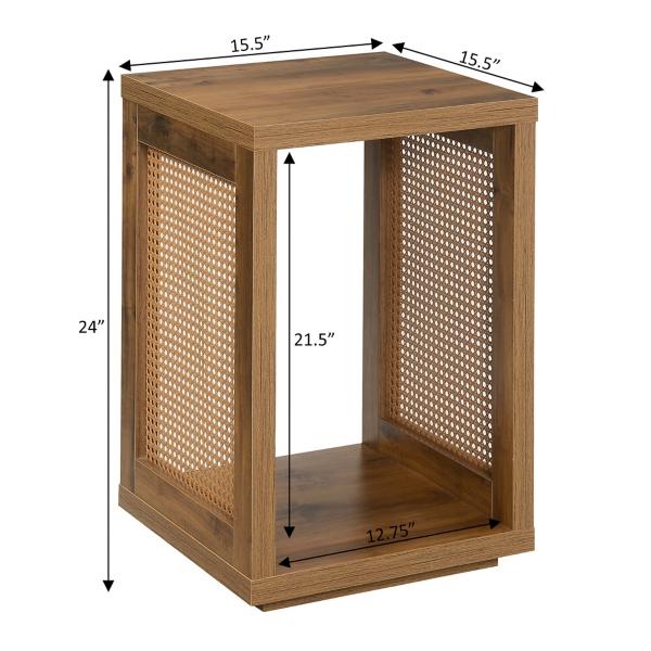 Intensify the bohemian style of your home with our Northfield Brown Woven Rattan Open Accent Table. Its rattan accents and abundant storage potential make for an ideal end table! Table measures 15.5L x 15.5W x 24H in. Crafted of engineered wood and rattan Brown wood finish Open design with one (1) bottom shelf Sides feature brown, woven rattan Square shape Weight: 19 lbs. Shelf weight capacity: 40 lbs. Assembly required Not intended for commercial use Care: Dust with a soft, dry cloth. This item is available at Kirklands.com only, not available in stores. Please note: this item cannot be shipped to APO/FPO addresses.