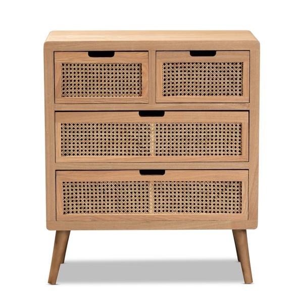 Complete your bohemian inspired space with our Oak and Rattan 4-Drawer Chest! This chest would make a lovely dresser or buffet table in your dining room. Chest measures 29.9L x 13.78W x 35.4H in. Crafted of wood and wood composite Oak wood finish Drawers are accented with a rattan face Features four (4) pull out drawers Tapered legs Some assembly required Not intended for commercial use Care: Dust with a soft, dry cloth. This item is available at Kirklands.com only, not available in stores. Please note: this item cannot be shipped to APO/FPO addresses. WARNING: This product can expose you to chemicals including formaldehyde and phthalate which is known to the state of California to cause cancer and birth defects or other reproductive harm. For more information go to www.P65Warnings.ca.gov.