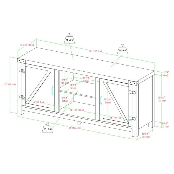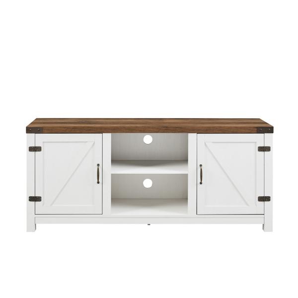 Don't be surprised if you catch yourself spending more time look at this beautiful stand than at the screen! The Oak Farmhouse Double Door TV Stand has the style and space you have been looking for. Stand measures 58.75L x 15.5W x 25H in. Crafted of wood and metal White and brown wood finish Black metal finish Farmhouse design Two (2) shelves Assembly required Not intended for commercial use Care: Dust with a soft, dry cloth. This item is available at Kirklands.com only, not available in stores. Please note: this item cannot be shipped to APO/FPO addresses. WARNING: This product can expose you to chemicals including dust and phthalates which is known to the state of California to cause cancer and birth defects or other reproductive harm. For more information go to www.P65Warnings.ca.gov.