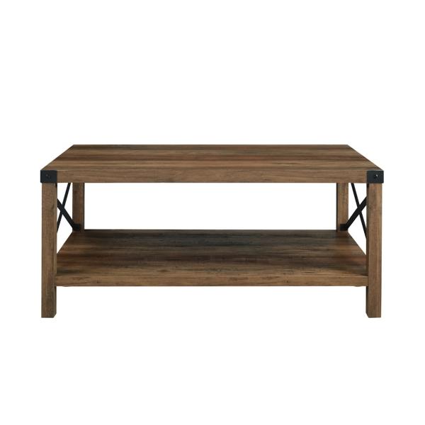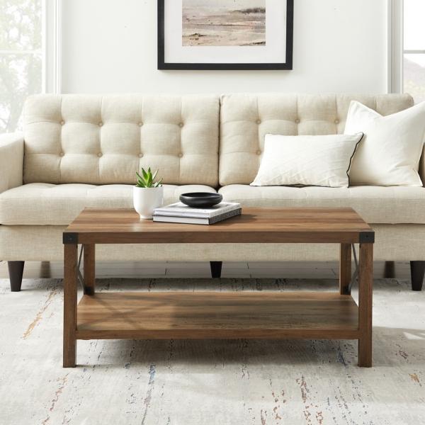 This Oak Industrial X-Frame Coffee Table would look great sitting in front of your leather couch! The bottom shelf has plenty of space for three wire baskets that provide extra storage and add to the industrial look. Accent table measures 40L x 18W x 22H in. Crafted of laminate and metal Oak finish Black metal finish Natural, wood grain details Metal x-shaped design on two (2) sides Bracket accents on top four (4) corners Features one (1) lower shelf for storage and display Rectangle shape Full assembly required Not intended for commercial use Care: Dust with a soft, dry cloth. This item is available at Kirklands.com only, not available in stores. Please note: this item cannot be shipped to APO/FPO addresses.