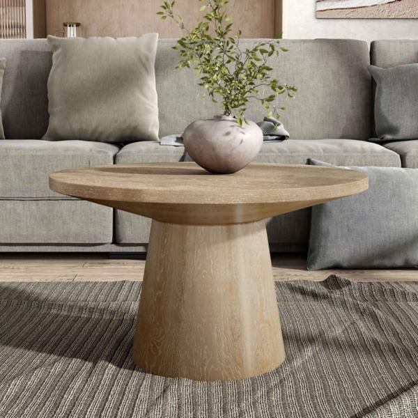 Make a bold, modern statement with this Oak Wood Round Leanne Coffee Table! This coffee table features a sleek cone-shaped pedestal base to give your living space a contemporary upgrade. Table measures 17H x 29 in. in diameter Crafted of rubberwood Oak finish Round shape Features a cone-shaped pedestal base Weight: 38 lbs. Weight capacity: 75 lbs. Assembly required; see Info & Guides in the drop down below to view or print assembly instructions Not intended for commercial use Care: Wipe with a soft, dry cloth. This item is available at Kirklands.com only, not available in stores. Please note: this item cannot be shipped to APO/FPO addresses.