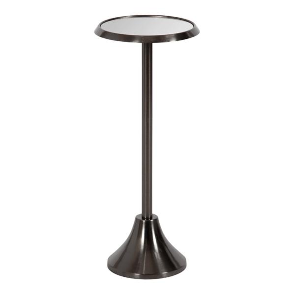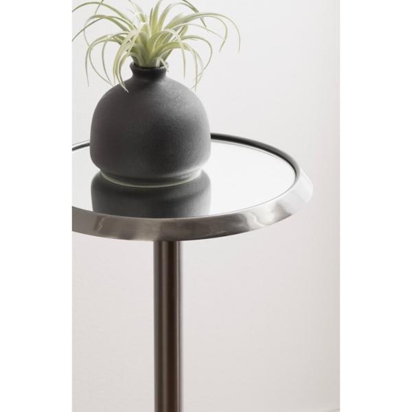 This Pewter Metal Mirrored Sanzo Accent Table is crafted with a stunning mirrored glass tabletop, making it a resilient yet stylish accent piece. Use this sleek side table as a place for your lamp, a drink or two, or a charming plant stand! Accent table measures 23H x 9.75 in. in diameter Crafted of metal Pewter finish Round shape Features a mirrored glass tabletop Weighted base Weight: 6 lbs. Weight capacity: 7 lbs. Some assembly required Not intended for commercial use Care: Wipe with a soft, dry cloth. This item is available at Kirklands.com only, not available in stores. Please note: this item cannot be shipped to APO/FPO addresses.