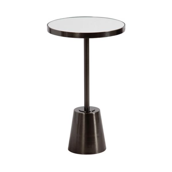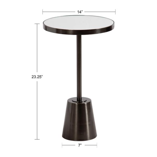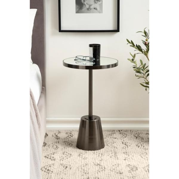 This Pewter Mirrored Tara Accent Table is sure to impress with its luxurious aesthetic! The mirrored tabletop will add a layer of depth and dimension to your space. Accent table measures 23.25H x 14 in. in diameter Crafted of metal Pewter finish Round shape Features a mirrored glass tabletop Weighted base Weight: 14 lbs. Weight capacity: 25 lbs. Some assembly required Not intended for commercial use Care: Wipe with a soft, dry cloth. This item is available at Kirklands.com only, not available in stores. Please note: this item cannot be shipped to APO/FPO addresses.