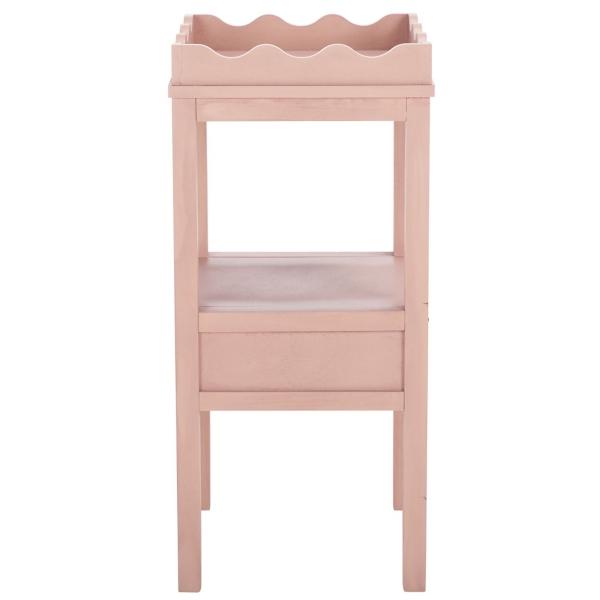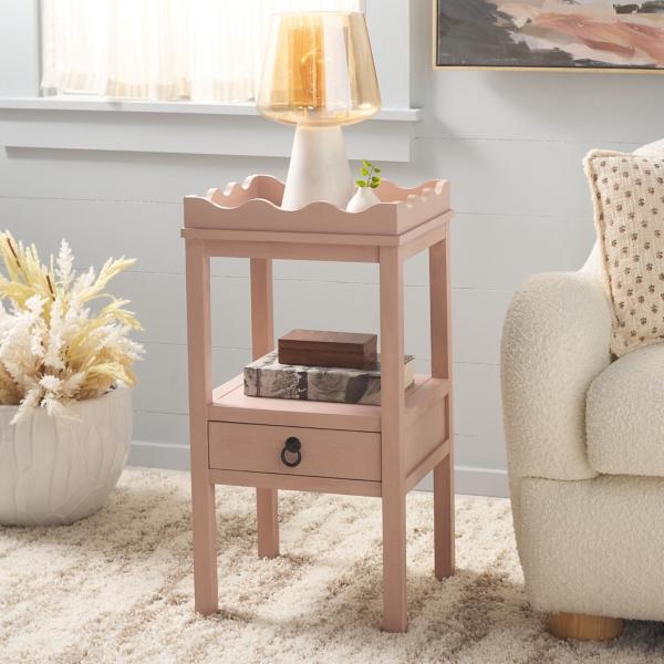 The Pink Lelia Cottage Accent Table will bring a kind of understated elegance to your living room. Detailed with a scalloped top, it's sure to make a charming display of decorative accents. Plus, the drawer and bottom shelf offers convenient storage space. Overall dimensions Width: 14.2 in. Depth: 13 in. Height: 28 in. Crafted of MDF Pink pine finish Features one (1) lower shelf Includes one (1) single drawer Scalloped top detailing Weight: 13 lbs. Weight capacity: 40 lbs. No assembly required Not intended for commercial use Care: Dust with a soft, dry cloth. This item is available at Kirklands.com only, not available in stores. Please note: this item cannot be shipped to APO/FPO addresses.