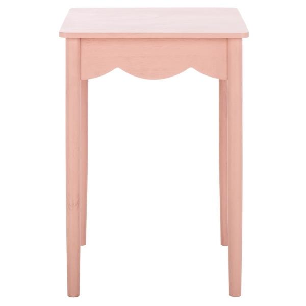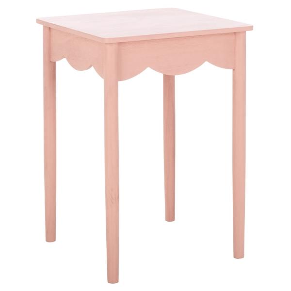 Bring elegance to your space with the smooth, contemporary design of this Pink Scalloped Cottage Kalina Accent Table. Its beautifully scalloped edge gives this table a charming touch of whimsy! Overall dimensions Width: 16.9 in. Depth: 16.9 in. Height: 24 in. Crafted of pine wood and wood composite Pink finish Square shape Features scalloped details Weight: 9 lbs. Weight capacity: 40 lbs. Assembly required Not intended for commercial use Care: Dust with a soft, dry cloth. Wipe spills immediately. Avoid common hazards such as hot dishes, harsh solvents, and abrasives. Adhesive felt pads to protect flooring are recommended. This item is available at Kirklands.com only, not available in stores. Please note: this item cannot be shipped to APO/FPO addresses.
