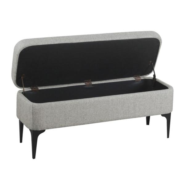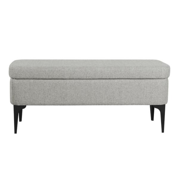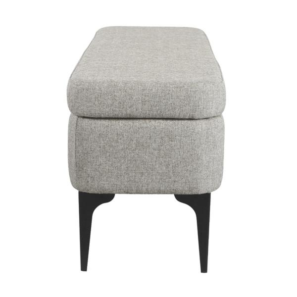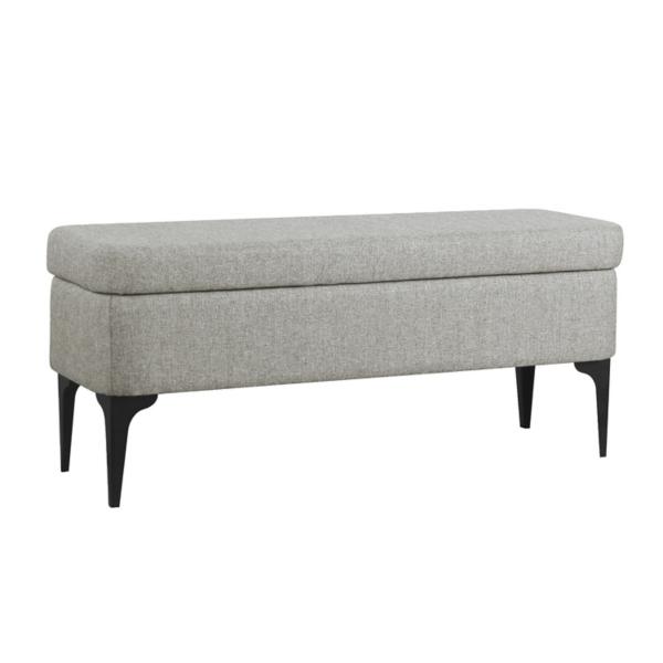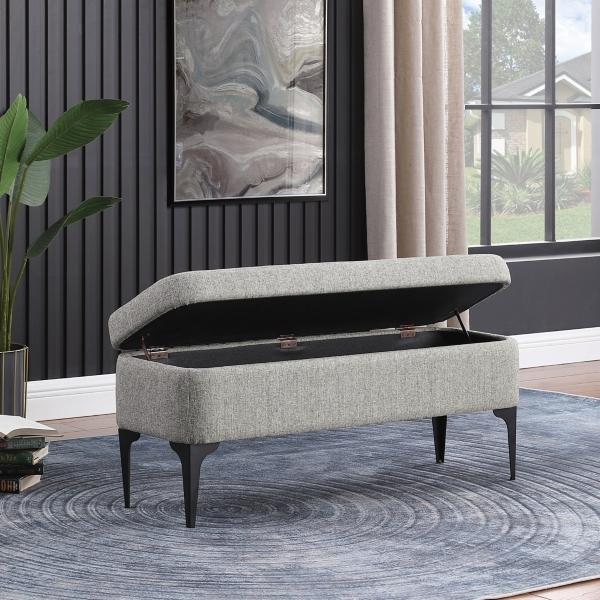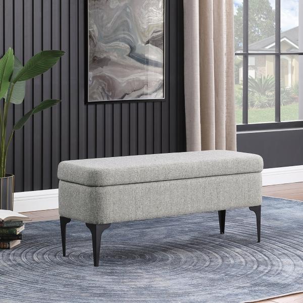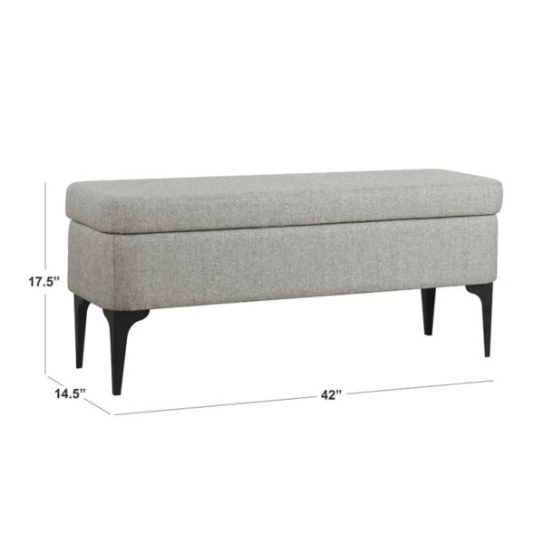 Add an element of stylish convenience to your space with this Ricardo Gray Woven Storage Bench! You’ll love being able to store clutter or blankets inside. Bench measures 42L x 14.5W x 17.5H in. Crafted with a metal frame Upholstered in 100% polyester fabric with a foam fill Gray finish with matte black legs Hinged bench top lifts to reveal storage space Weight capacity: 250 lbs. Some assembly required Not intended for commercial use Care: Spot clean only. Not safe for outdoor use. This item is available at Kirklands.com only, not available in stores. Please note: this item cannot be shipped to APO/FPO addresses.