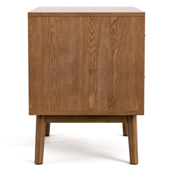 Elevate your bedroom with this Riverstone Walnut 2-Drawer Nightstand! This mid-century modern nightstand is a stunning addition to your space, adorned with sleek brass handles that enhance its vintage appeal. Nightstand measures 23W x 15.5D x 22H in. Crafted of rubberwood with wood grain veneer Walnut finish Features two (2) drawers Angled legs Brass hardware finish Each drawer measures 19.5W x 13D x 4H in. Assembly required; see Info & Guides in the drop down below to view or print assembly info Not intended for commercial use Care: Wipe with a soft, dry cloth. This item is available at Kirklands.com only, not available in stores. Please note: this item cannot be shipped to APO/FPO addresses.