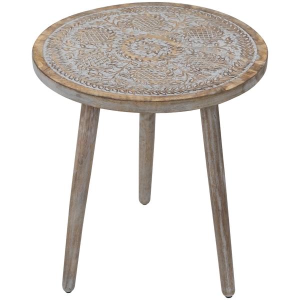 Bring a sense of rustic elegance to any space with the Round Antique Gray Engraved Accent Table. Detailed with beautiful botanical patterns, it will look lovely with boho and farmhouse decor! Table measures 21H x 18 in. in diameter Crafted of wood Antique gray finish Features engraved botanical and geometric patterns Round shape Tripod leg Easy assembly; legs can be detached by unscrewing them Not intended for commercial use Care: Dust with a soft, dry cloth. This item is available at Kirklands.com only, not available in stores. Please note: this item cannot be shipped to APO/FPO addresses.