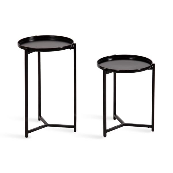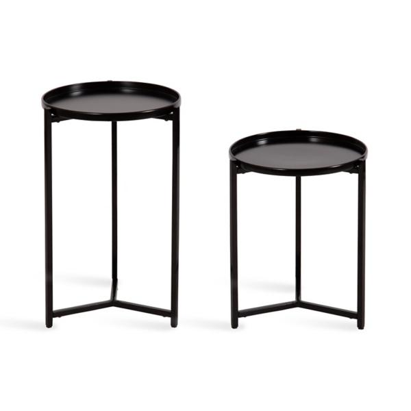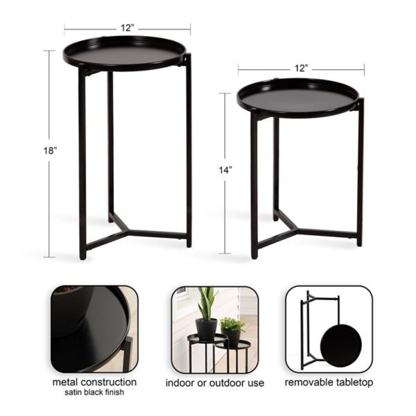 Discover a beautiful way to showcase your decorative house plants and other household items with our charming Round Black Metal Accent Tables, Set of 2. Set includes two (2) tables Large table measures 18H x 12 in. in diameter Small table measures 14H x 12 in. in diameter Crafted of metal Black finish Round tray tabletop Tabletops are removable Weight capacity for each table: 10 lbs. Assembly required Not intended for commercial use Care: Dust with a soft, dry cloth. This item is available at Kirklands.com only, not available in stores. Please note: this item cannot be shipped to APO/FPO addresses. WARNING: Cancer and Reproductive Harm - For more information go to www.P65Warnings.ca.gov.
